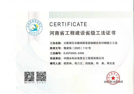 日前,公司引江補漢項目團隊申報的《水利工程大縱坡施工支洞襯砌施工工法》等3項成果獲得河南省省級工法認定,至此,引江補漢項目技術團隊全年共獲得省部級工法9項,2025年工法“小目標”圓滿完成。