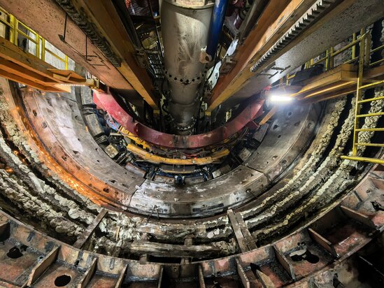 成眉線紅蓮站至秦皇寺站左線盾構區(qū)間長471米(單延米),主要地層為中風化泥巖地層?!敖慈奶枴倍軜嫏C需在地下穿越既有軌道交通6號線秦皇寺站、重要市政設施及多種不良地質層,技術難度高、安全風險大。項目團隊創(chuàng)新采用“先暗挖、后盾構空推”的工法,預先采用礦山法精細化開挖并支護形成了一段堅實的暗挖隧道,作為盾構機的“地下組裝車間”和“安全始發(fā)平臺”,盾構機主體部件被分體吊裝至地下,在該暗挖隧道內完成組裝、調試,并通過軌道系統平穩(wěn)“空推”至預設的掌子面,最終實現安全、精準推進。此項工藝有效規(guī)避了傳統模式可能面臨的涌水涌沙風險,極大降低了對既有線地鐵和周邊環(huán)境的影響。