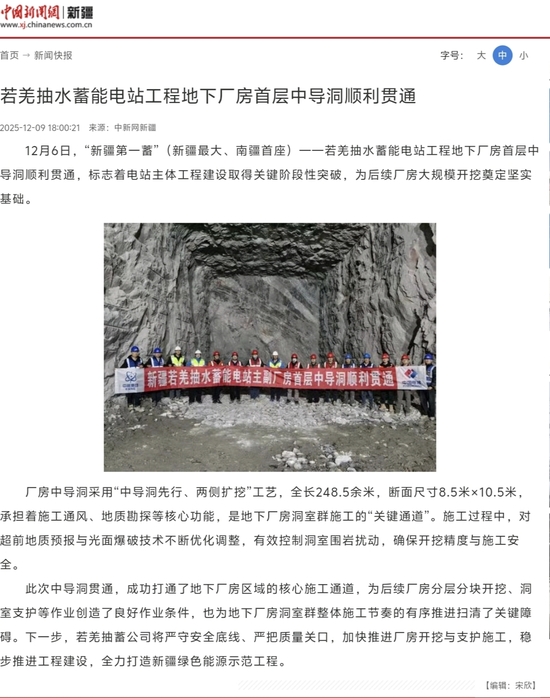 12月6日,“新疆第一蓄”(新疆最大、南疆首座)——若羌抽水蓄能電站工程地下廠房首層中導(dǎo)洞順利貫通,標(biāo)志著電站主體工程建設(shè)取得關(guān)鍵階段性突破,為后續(xù)廠房大規(guī)模開挖奠定堅(jiān)實(shí)基礎(chǔ)。