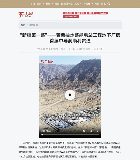 12月初,新疆若羌抽水蓄能電站工程地下廠房首層中導洞順利貫通,標志著電站主體工程建設(shè)取得關(guān)鍵階段性突破,為后續(xù)廠房大規(guī)模開挖奠定堅實基礎(chǔ)。作為“新疆第一蓄”(新疆最大、南疆首座抽水蓄能項目),若羌抽水蓄能電站工程建設(shè)總工期共81個月,首臺機組計劃于2030年9月發(fā)電,2031年12月全面建成,電站主要服務于南疆電網(wǎng)及新能源消納,節(jié)能減排效益顯著。