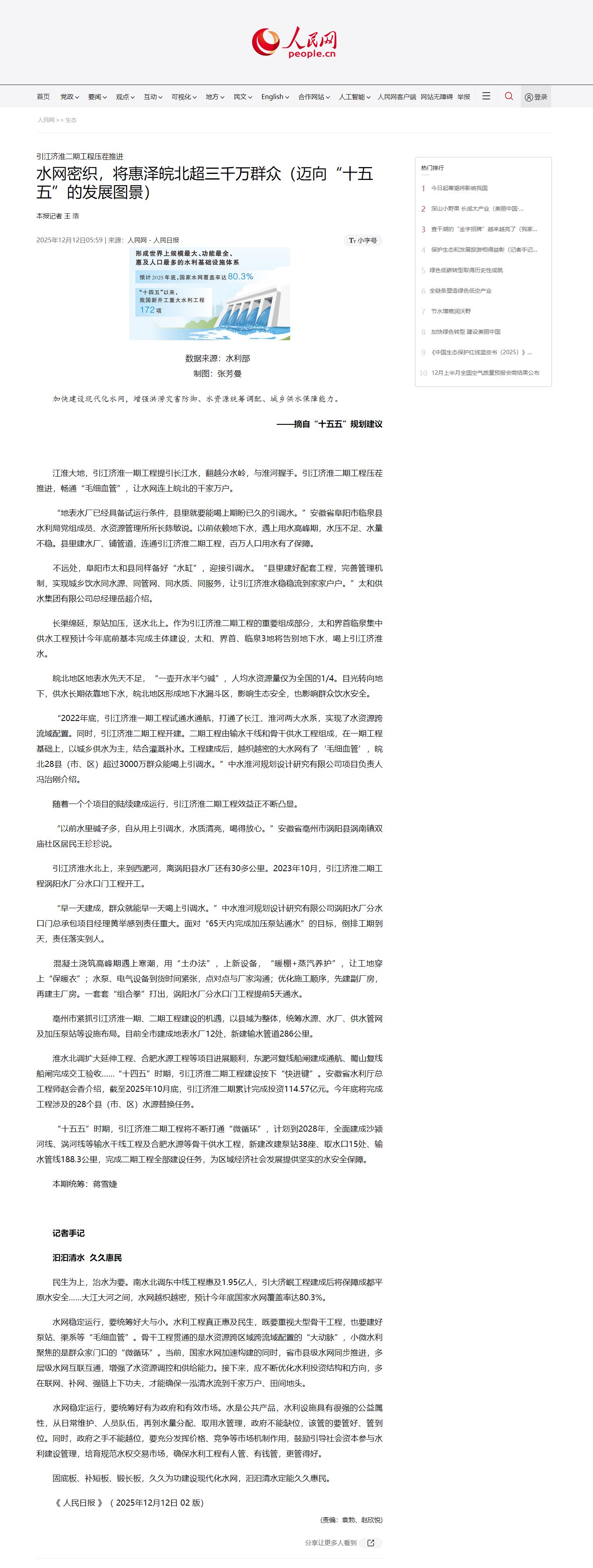 民生為上,治水為要。南水北調(diào)東中線工程惠及1.95億人,引大濟岷工程建成后將保障成都平原水安全……大江大河之間,水網(wǎng)越織越密,預計今年底國家水網(wǎng)覆蓋率達80.3%。