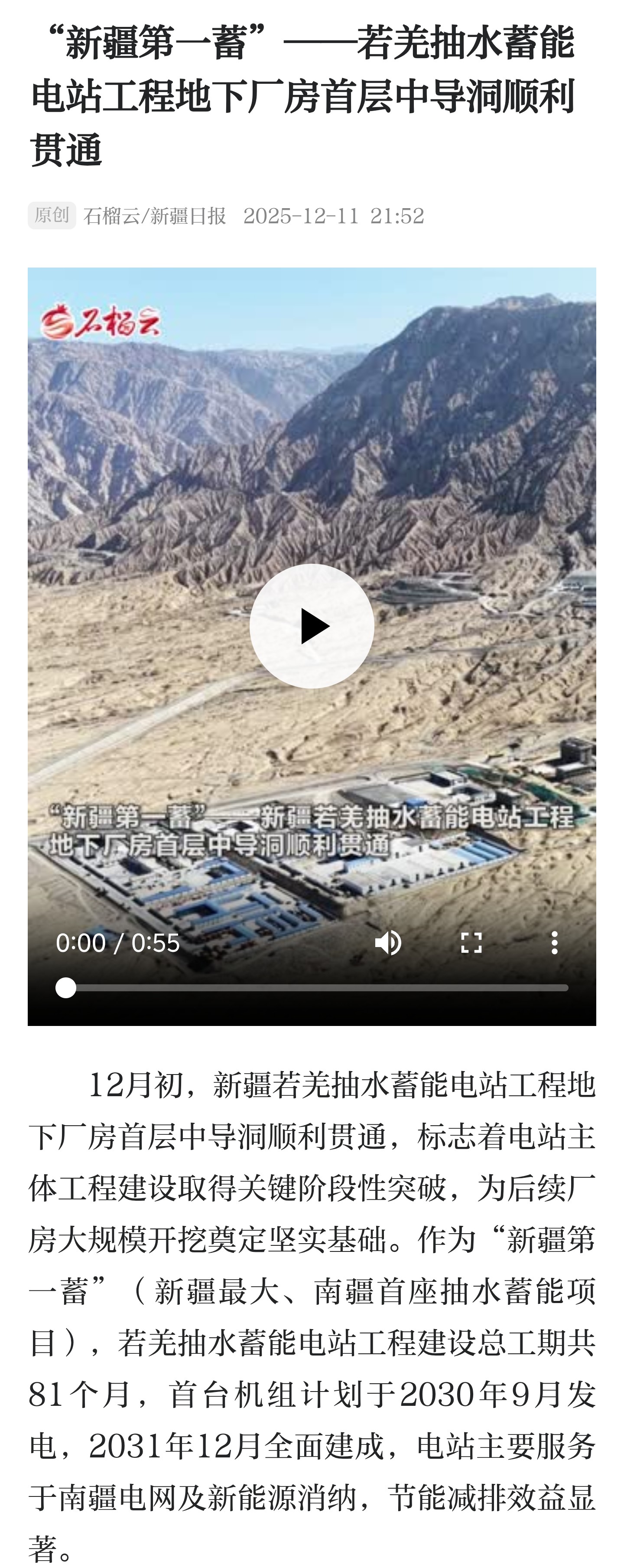 12月初,新疆若羌抽水蓄能電站工程地下廠房首層中導(dǎo)洞順利貫通,標(biāo)志著電站主體工程建設(shè)取得關(guān)鍵階段性突破,為后續(xù)廠房大規(guī)模開挖奠定堅實基礎(chǔ)。作為“新疆第一蓄”(新疆最大、南疆首座抽水蓄能項目),若羌抽水蓄能電站工程建設(shè)總工期共81個月,首臺機組計劃于2030年9月發(fā)電,2031年12月全面建成,電站主要服務(wù)于南疆電網(wǎng)及新能源消納,節(jié)能減排效益顯著。