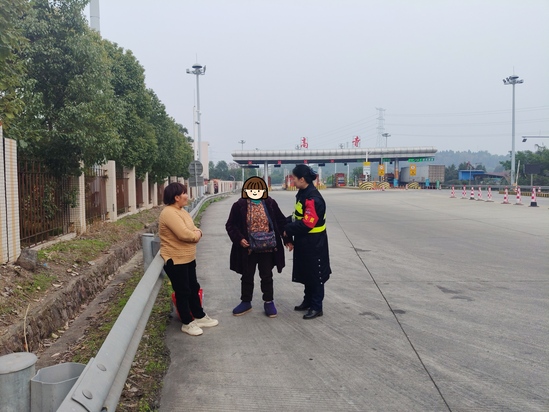 時(shí)間回溯至12月8日上午,高寺收費(fèi)站外廣場(chǎng)車流量大、過(guò)往車輛川流不息。當(dāng)班值班長(zhǎng)楊群英巡查時(shí),發(fā)現(xiàn)兩名老人神色焦急地徘徊,存在極大安全隱患,她當(dāng)即主動(dòng)上前關(guān)切詢問(wèn)。經(jīng)耐心溝通得知,老人因不熟悉路況誤入高速,未攜帶手機(jī),無(wú)法聯(lián)系家屬,僅知曉要前往涼水鎮(zhèn)。