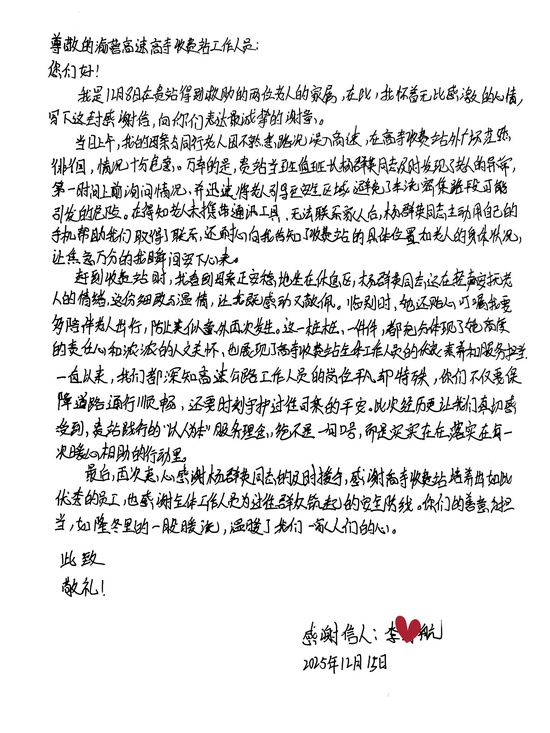 “收費(fèi)站工作人員的及時(shí)援手,不僅成功規(guī)避了意外風(fēng)險(xiǎn),更讓我們真切感受到高速服務(wù)的溫度與社會(huì)責(zé)任擔(dān)當(dāng)?!奔覍僭诟兄x信中如是寫(xiě)道。